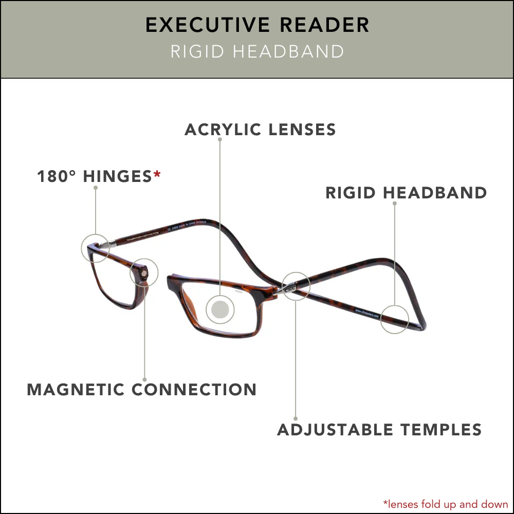 The CliC Executive is our most professional style with its sleek profile and timeless look.Ā It features a larger lens area with a wider, slightly deeper rigid headband.