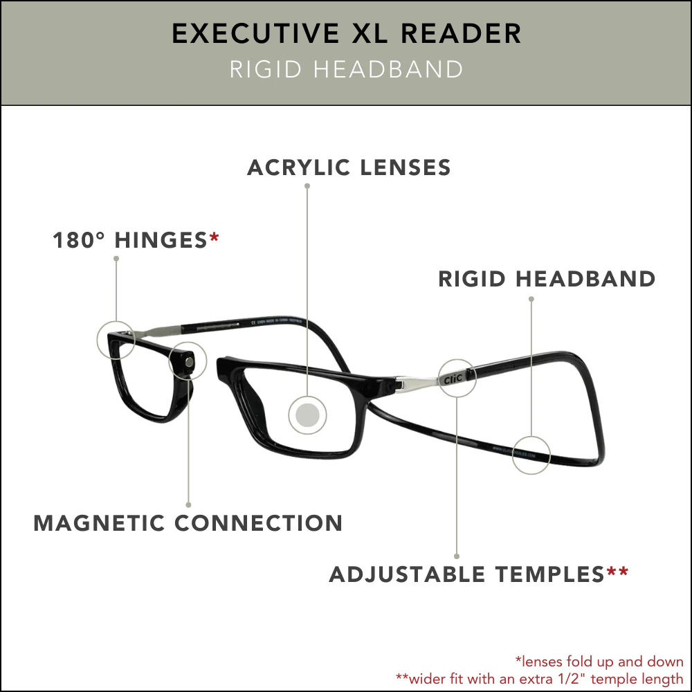The CliC Executive XL is our most professional style with its sleek profile and timeless look.Ā It features a larger lens area with a wider, slightly deeper rigid headband.