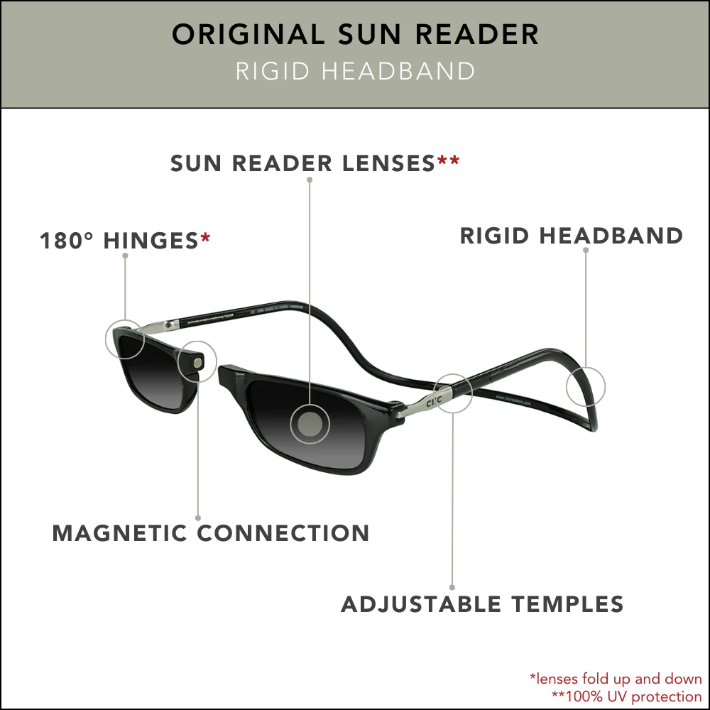 THE ORIGINAL. This Sun Reader offers 100% UV protection with full lens magnification in our most popular frame choice.