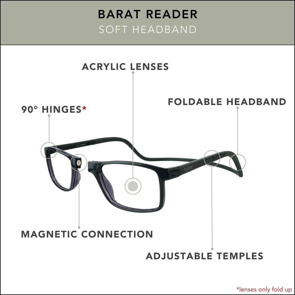 The Barat style features rectangular lenses with a soft and foldable headband that adjusts at the temples providing you with a perfect fit.